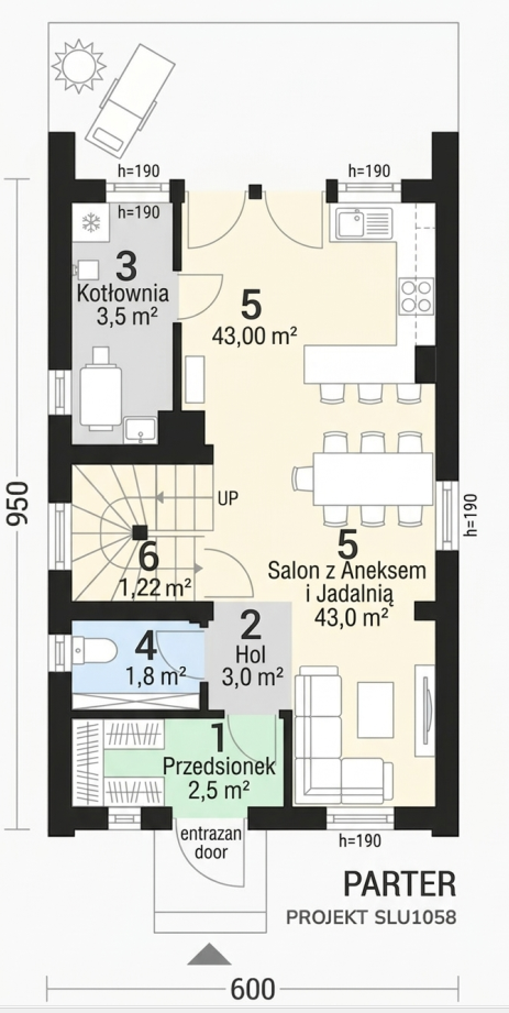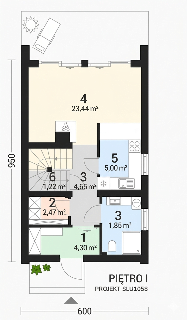 Powierzchnia i układ: Dom L-302N to parterowy budynek z użytkowym poddaszem o powierzchni użytkowej 67,61 m². Jego bryła ma zaledwie 6 m szerokości, co idealnie nadaje się na wąską działkę. Rozkład pomieszczeń jest bardzo funkcjonalny.