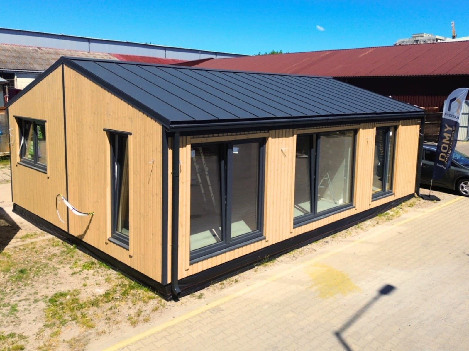 Dom modułowy powstaje w kontrolowanych warunkach hali produkcyjnej, co gwarantuje wysoką jakość wykonania oraz szybki czas realizacji inwestycji.
